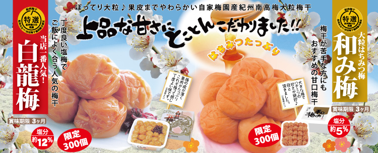 TOP 梅の春祭 表示切替: 写真のみ 説明付き 並び順: 標準 レビューの多い順 おすすめ商品順 新着商品順 値段の安い順 値段の高い順 名前:昇順 名前:降順 9件中1件~9件を表示 商品一覧 紀州 特選南高梅 白龍梅 800g 化粧箱 塩分約12% 和歌山 みなべ 梅干 ギフト ¥3,450(税込) 在庫 在庫あり 紀州 特選南高梅 和み梅 500g 化粧箱 塩分約5% 大粒はちみつ梅 和歌山 みなべ 自家梅園産 梅干 ¥2,750(税込) 在庫 在庫あり 紀州 特選南高梅 白龍梅 の 種なし梅 100g 簡易包装 塩分約12% 和歌山 みなべ 梅干 ギフト ¥950(税込) 在庫 在庫あり 紀州 特選南高梅 白龍梅 の 種なし梅 160g 化粧箱 塩分約12% 和歌山 みなべ 梅干 ギフト ¥2,000(税込) 在庫 在庫あり 本格梅酒「Ryu」 500ml 紀州南高梅 本格梅酒 アルコール度数12% GI「和歌山梅酒」認定 iti優秀味覚賞受賞 ¥1,760(税込) 在庫 在庫あり 日本酒仕込み 紀州南高梅梅酒 「和zipang」500ml・アルコール度数10% 化粧箱入り GI「和歌山梅酒」認定 itQi優秀味覚賞受賞 ¥1,870(税込) 在庫 在庫あり 紀州産の青梅の果汁を煮詰めました。(純国産無添加) 青梅梅エキス(梅肉エキス)90g ¥2,646(税込) 在庫 在庫あり 梅のパワーで毎日健康!! 黒いつぶつぶ 完熟梅肉エキス(粒)サラサラ 100g(約660粒) ¥3,996(税込) 在庫 在庫あり 飲み易さ◎ 梅のパワーで毎日健康!! 黒いつぶつぶ 完熟梅肉エキス(粒) ラミパック120g(約800粒) 当店通常価格: ¥3,888(税込) 価格: ¥3,888(税込) 在庫 在庫あり 9件中1件~9件を表示