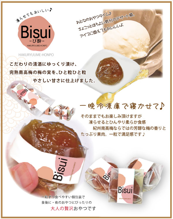 TOP 梅ジャム・梅のお菓子「Bisui 」-微酔- びすい 梅酒の梅 2025お中元南高梅スイーツ 梅ジャム・梅のお菓子「Bisui 」-微酔- びすい 梅酒の梅Bisui -びすい- 創業祭創業祭限定 梅ジャム・梅スイーツ 創業祭 2025お歳暮 お年始に手づくり梅スイーツBisui&Bisui bitter やさしい、梅酒風味の梅の実です。 紀州完熟南高梅 大人の冷菓 Bisui 個包装 7個詰 びすい ビスイ 梅酒の梅 梅デザート 梅のお菓子 バレンタン ホワイトデー 価格: ¥820 (税込) [ポイント還元 8ポイント~] 販売期間: 数量: 個 在庫: 在庫わずか 在庫 在庫わずか レビューはありません ■名 称 Bisui-微酔-(びすい) 内 容 量 7 個 原 材 料 梅・砂糖・清酒 賞味期限 3ヶ月 ◎ご一緒にいかがですか◎ 紀州 特選南高梅 和み梅 500g 化粧箱 塩分約5% 大粒はちみつ梅 和歌山 みなべ 自家梅園産 梅干 ¥2,750(税込) 在庫  在庫あり 数量:0123456789101112131415161718192021222324252627282930 個 紀州 特選南高梅 あっさり白龍 850g 化粧箱 梅の実の大きさ・大粒(3L) 塩分約8% 自家農園産 和歌山 みなべ 梅干し ¥3,700(税込) 在庫  在庫あり 数量:0123456789101112131415161718192021222324252627282930 個 紀州 特選南高梅 健か梅 壽ぎ梅 高級和紙包み 8包 詰合せ 特々大粒 和歌山 みなべ 梅干 お歳暮 ギフト ¥2,860(税込) 在庫  在庫あり 数量:0123456789101112131415161718192021222324252627282930 個 送料無料 ギフト 極上 紀州 南高梅 黄金梅柄の 重箱入 一粒包 健か梅・寿ぎ梅 一段重 高級 黒重箱 風呂敷包 和歌山 みなべ 自家梅園産 梅干 詰合せ ギフト ¥3,850(税込) 在庫  在庫あり 商品を見る 紀州 特選南高梅 和み梅 800g 化粧箱 塩分約5% 大粒はちみつ梅 和歌山 みなべ 自家梅園産 梅干 ¥4,180(税込) 在庫  在庫わずか 数量:0123456789101112131415161718192021222324252627282930 個