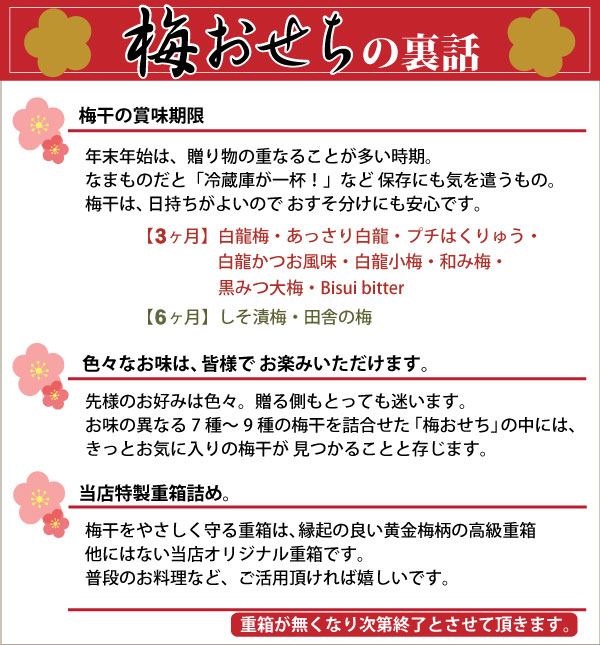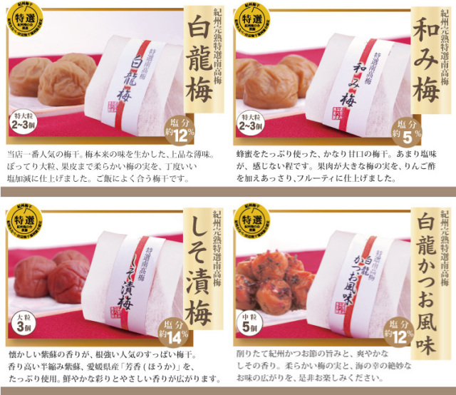 | 白龍梅 | 特大粒 (3L〜4L) | 南高梅 (自家梅園産) | 約12% (中甘口) | 梅・漬け原材料(食塩・還元水飴・果糖ぶどう糖液糖・蜂蜜) /調味料(アミノ酸等)・甘味料(スクラロース)・酒精・VB1 | 3ヶ月 |