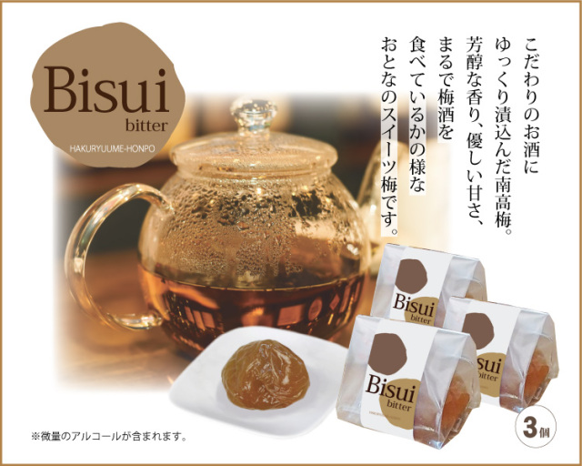 | び酔 Bisui bitter | 大粒(L) | 南高梅 (自家梅園産) | 約0% | 梅・砂糖・醸造アルコール・蜂蜜 | 3ヶ月 |
